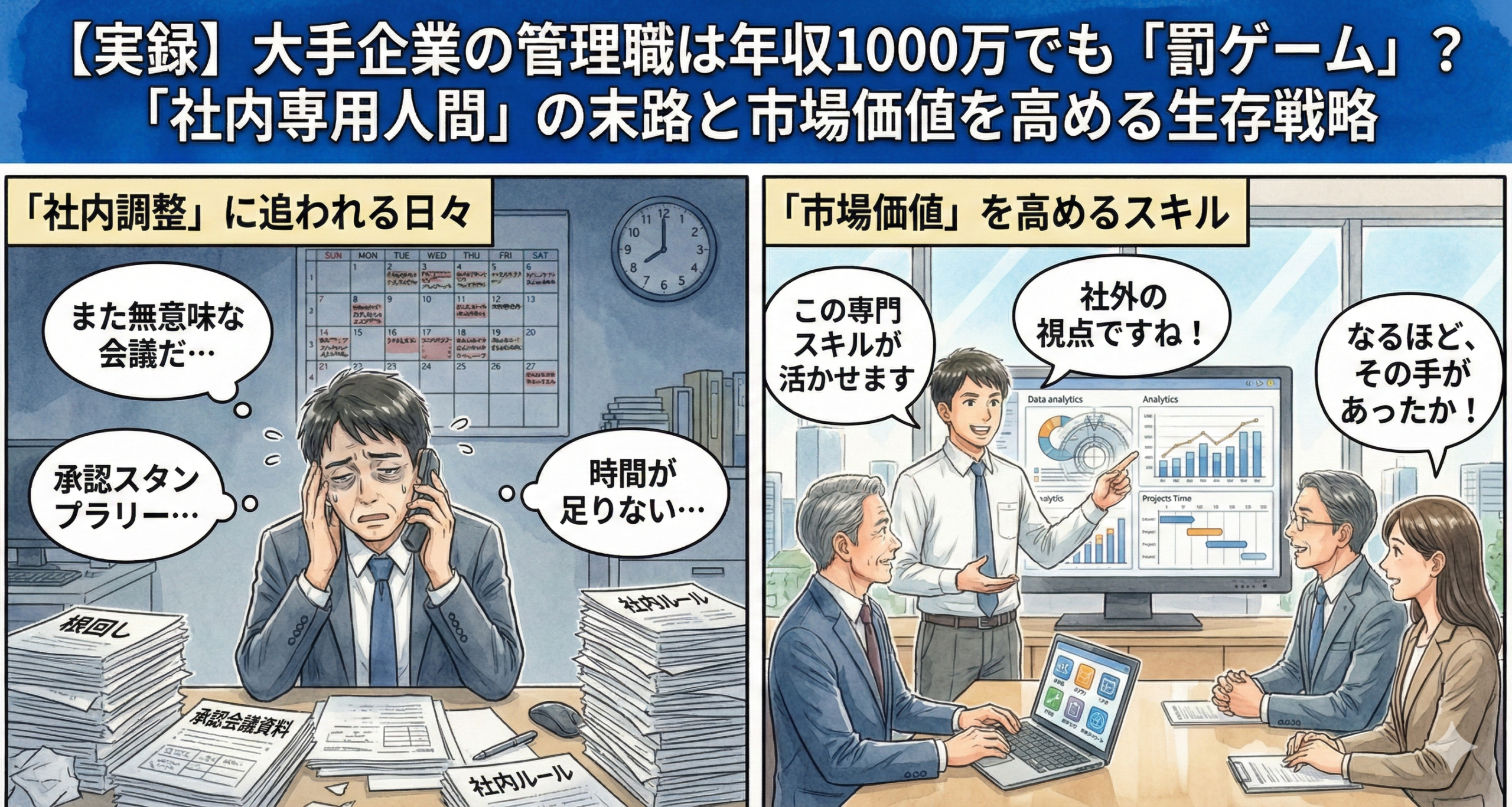 大手企業の管理職=勝ち組だと思っていませんか?年収1000万円を超えても「割に合わない」と言われる衝撃の理由を現役社員が暴露。残業代なし、土日稼働、そして最も恐ろしい「市場価値の消滅」リスクとは。出世レースの先にある現実と生存戦略を解説します。