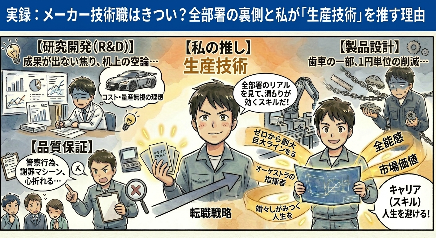 今回は、私が現場で見てきた「メーカー技術職の生々しい現実」をバッサリ斬りつつ、なぜ私が最終的に「生産技術が一番おすすめ(最強)」だと断言するのか、その理由を語ります。